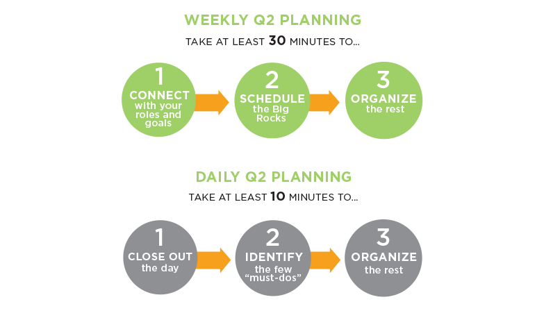 If you work on the gravel first, there’s never time for the Big Rocks. You can never get ahead by just sorting through the gravel faster. But if you prioritize the Big Rocks first, the gravel falls into place as appropriate. It’s a simple process that happens through weekly and daily Q2 planning.