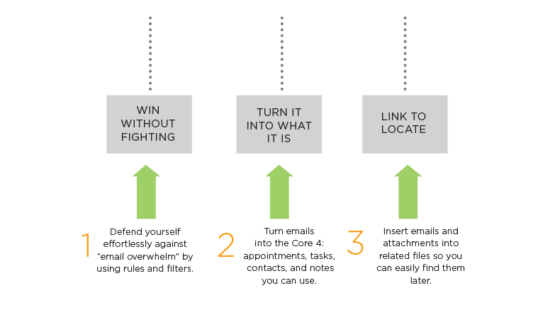 Eliminate any additional Q3 and Q4 activities from your inbox that rules and filters did not handle, then effectively manage the Q1s and Q2s. Since every email fits into one or more of the core 4, you can immediately Turn It Into What It Is and get it out of your inbox