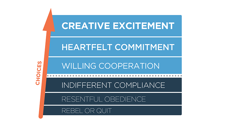 At FranklinCovey, we’ve found that employees typically fall on a spectrum, with a distinct difference between the bottom and top three levels. Note the dotted line in the middle. Team members above the line are doing the job because they want to, while those below are doing the job because they have to. If people are indifferently compliant or lower, you will have to tell them over and over what to do, because they won’t do it on their own.